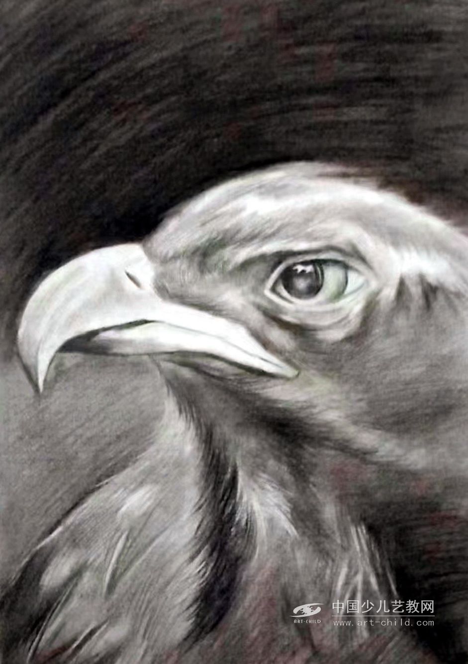 整体而言,作品虽出自孩童之手,却在造型严谨性与情感表达上均有不俗表现。作者对明暗节奏的把控、对细节的耐心打磨,以及对鹰的精神气质的捕捉,都展现出良好的艺术感知力与专业潜质。若能在颈部羽毛的疏密节奏上进一步强化对比,将使画面的张力更上一层楼。