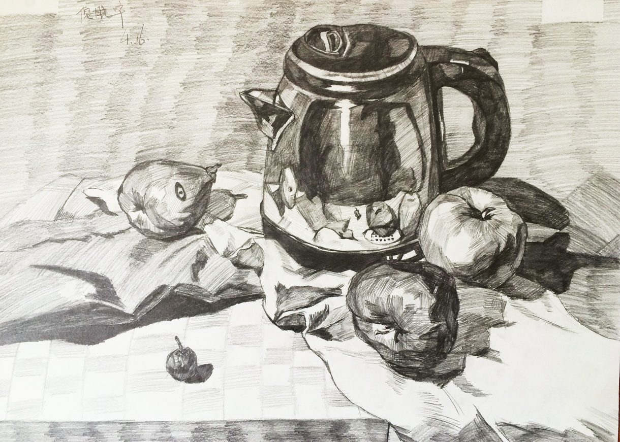 作为 13 岁学生的作品,这幅静物素描已展现出超越年龄的造型能力与画面把控力。画面以不锈钢水壶为视觉核心,通过稳定的三角构图将水果与衬布有序铺陈,主体突出且主次关系清晰,体现了作者对经典静物构图逻辑的良好把握。在质感塑造上,作者对不锈钢水壶的表现尤为亮眼,通过强烈的明暗对比、精准的高光与环境反光处理,生动还原了金属材质的光滑坚硬与镜面反射特性,壶身的高光形态与周围物象的呼应,可见其对光影规律的细致观察。衬布褶皱则通过疏密变化的排线与块面归纳,既表现出布料的柔软垂坠感,又通过虚实过渡有效衬托主体,黑白灰层次分明,整体色调统一且富有节奏。