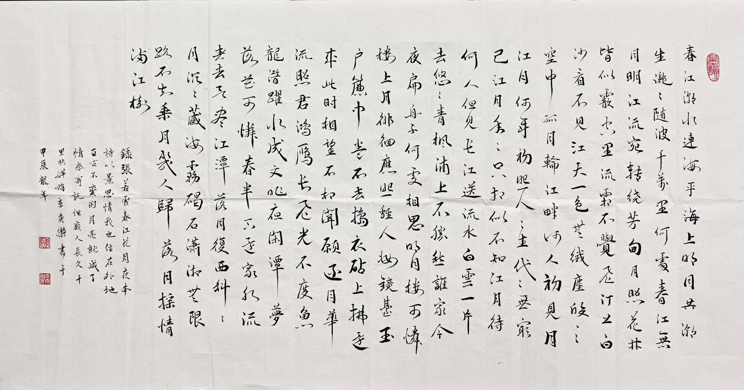 以 11 岁少年李奕乐所书《春江花月夜》行书作品观之,其展现出的帖学功底与艺术感知,已远超同龄学习者的平均水准。此作取法赵孟頫一脉,笔法上恪守传统法度:起笔多藏锋逆入,如 “春”“江” 等字沉劲稳健;行笔提按转折精准,“潮” 字三点水牵丝映带轻盈却不失筋力,“月” 字弯钩圆转中暗含张力,显见日常临帖的扎实训练。结体处理兼顾端庄与灵动,“孤” 字欹侧而重心稳固,“流” 字舒展却无松散之弊,既守帖学结字的规整,又具行书的姿态变化。