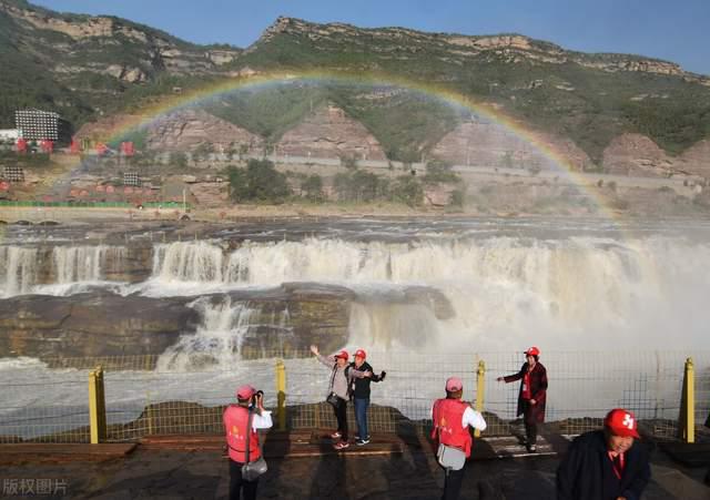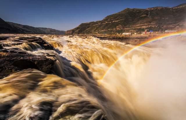 狭中河流,急如飞箭,翻着雪浪,喷着烈焰,长舌翻卷,飞花溅玉,吵着闹着争着往前闯,你不让我我不让你的,那真是“奔腾不息,万马战犹酣”。那瀑布,亮着金子一样的光,吼着震耳欲聋的雷,带着凌厉无比的风,携着惊天动地的力,展着奇幻绮丽的形,闪着五光十色的彩,如一只巨鹰展翅俯冲,如一幅巨画挂于山岩,奔流不息却看似不流,变幻不定也形如不动。瀑布的周围喷洒细如粉末的雨雾,落在脸上有一种特别的清爽,像是黄河在亲吻你,像是黄河来拥抱你,你会感到黄河真像是你的母亲,以一种特殊的形式哺育我们。瀑的两侧,舞动无数的彩虹,随着你观看位置的不同而不同,这时你完全可以体会长虹卧波的奇妙了。