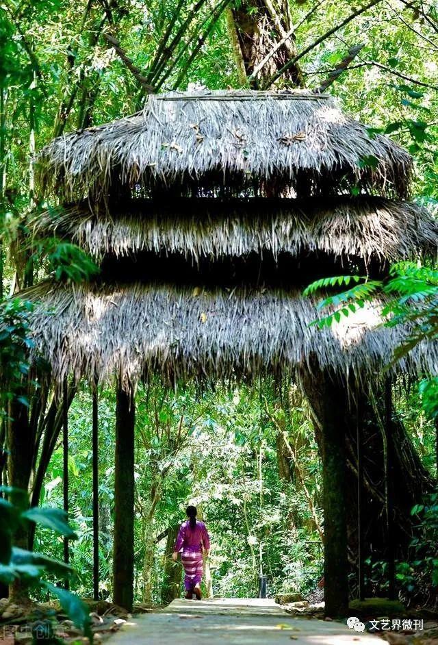 古树藤自然编织形成的树下,我们看到了树根缠绕而搭起来的树藤屋,我又一次地惊呼!大自然造物的奇观,如此巧夺天工的神奇,醒然惊艳的美丽,让我陶醉于此,感受着这里的树叶茂密的阴凉,使我久久地不愿离去,吃点冷饮,喝点冷茶,我感觉到了无比的舒适爽朗,增添了几分精神,于是又开始了徒步跋涉。