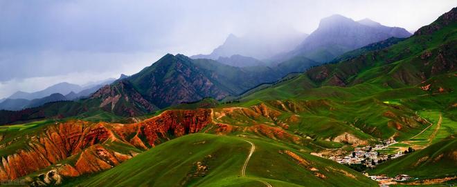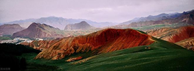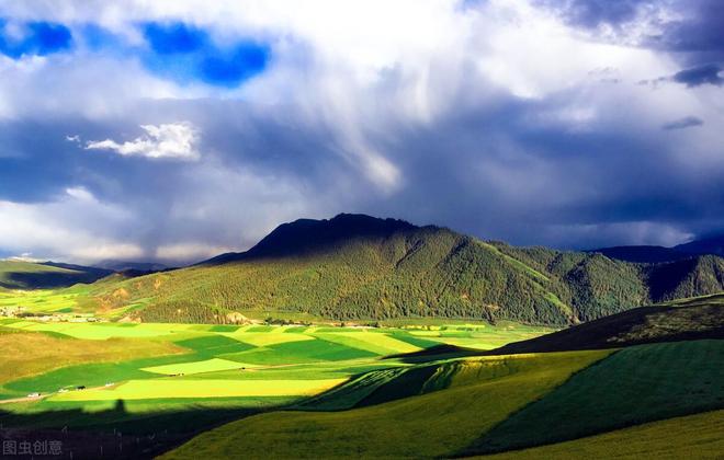 车往东行,缓缓而上。东边一隅,一条偌大沟谷平缓远去,黄花直抵天边,山岭曲线皆凸凹有致。从云间透下来的光束,一簇簇,一片片,追光灯似地从油菜花地上掠过。明暗相间,苍山相映,白云相吻,晨雾缠绵。远处村落,偶有几声鸡鸣犬吠,疑误入桃花源也。桃源梦境不绝于眼。车子向东而北,近处,塔松高耸,中间,则是红绿相间的山坡,再往上则雪线褪尽,雪山之巅遭冰雪蹂躏至今,亿万年,唯剩下瘦骨嶙峋之山峰,几片旗云飘绕其上,似匈奴王、古浴浑王之招魂经幡,迎风飘动。上至停车场,跨出车门,蓦然回首间,东北之隅又是一处绝域风景。投目远处,一片红沙岩山脊迤迤而上,小草连缀成片,村舍、城郭、小河、红土路散落人间。俯首之间,缩小则为一幅山水巨轴,放大则是一座天上宫阙,不知何年何月,坠落人间。