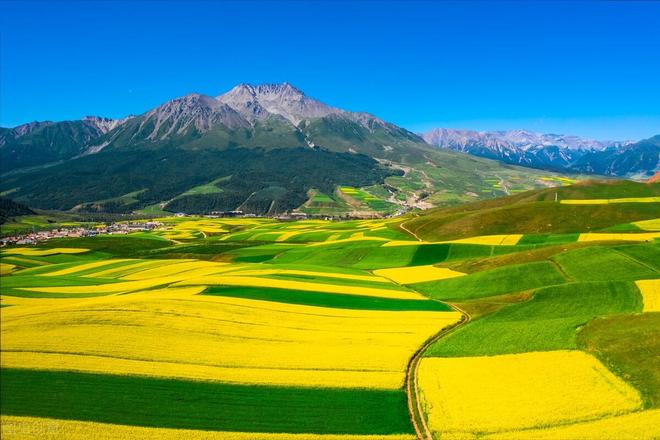 辛茜主编见余被景迷,狂拍一番,丽人之色又添几分怡然。问余:徐君逛遍神州,见过如此绝美之景乎。余曰:未答,藉句大俗之语:祁连风光甲天下,卓尔归来不看山。真俗了,不配入此仙境,离开祁连山,必须留下一句精妙之语。入大门,登旅游车逶迤山间,回望四野,苍穹之下,正东,东南,东北一隅,皆可称一步一风光,一台一山水。一山一画意。车抵卓尔山高台,一步跃下,余便被南方风光所惑,一条大沟壑,纵深十数里远,油菜花漫漶无涯,墨云远村,阳光裂云,连成天边地平线之景。向西眺望,祁连县主峰巍然于前,半山坡上,一座经塔兀立于西侧,风铎点点,而极目处,则苍山青黛,岚烟袅袅,一条巨大旗云横绕于山间,那融尽积雪之峰巅,犹如一位匈奴大将军,在风中怒吼:失我祁连山,使我六畜不蕃息,失我焉支山,使我嫁妇无颜色。