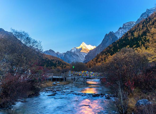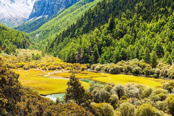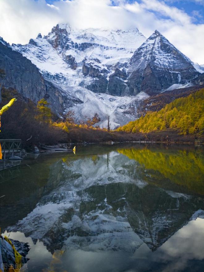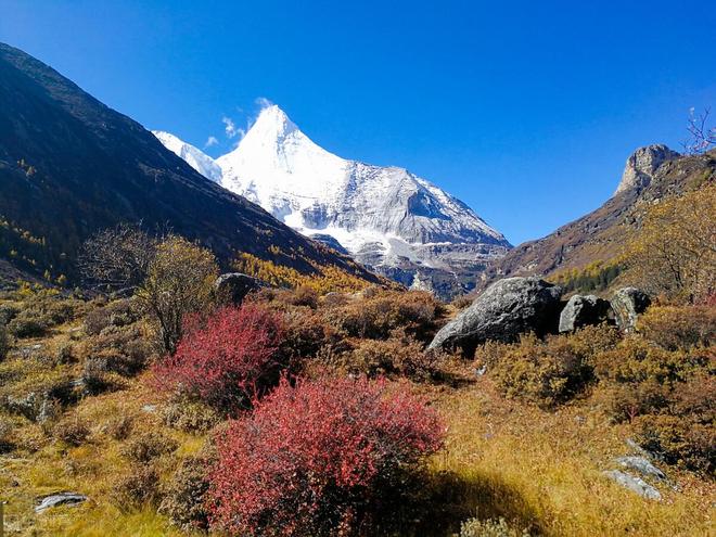 到山里面的游客中心后下车走栈道。向前走的时候,看到右手边一座雪山顶也是在空中闪现。这座雪山与我们在车上看到的那一座山峰不一样,应是三座神山中的另一座(夏诺多吉)。雪山漂亮得引起游人驻足拍照,赞不绝口。