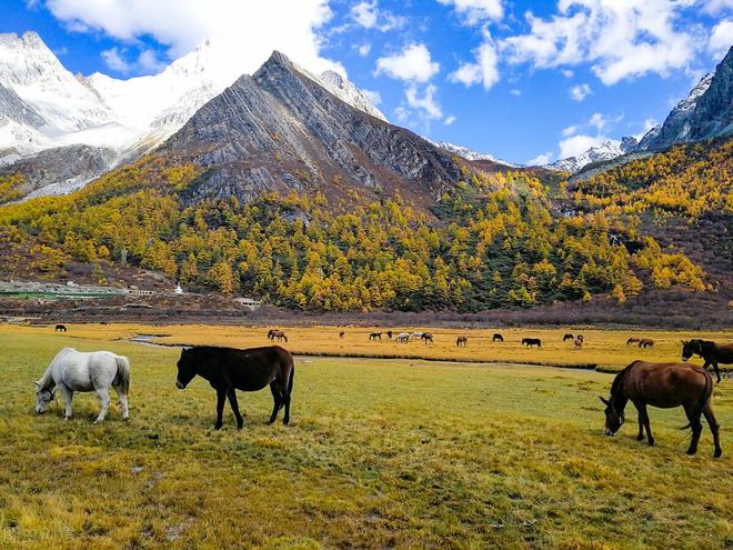 我们看到一座雪山的山峰在天空中时隐时现,如梦如幻。只是至今都不清楚,我们在车上看到的是稻城亚丁三座神山中的哪一座呢?