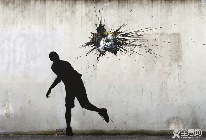 乍看之下是一个少年的背影,他投出的水球,爆裂在眼前的这面墙上。画面中最引人注目又充满熟悉感的是『马奈』最著名的作品之一《草地上的午餐》,目前为巴黎奥赛美术馆所藏,而Pejac笔下的这位少年投掷水球的地点正巧就在巴黎街头,或许重要的艺术作品在整个艺术史的鸿沟中,就如炸开的水球一样,投掷者狠狠地向前抛,炸开在众人眼前,一瞬,即是永恒。