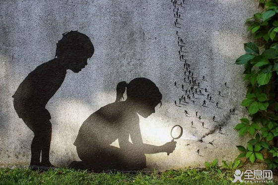 如果你以为是一对好奇的小姐弟在院子里好奇玩耍,拿着放大镜关长蚂蚁,那就大错特错了!把视线拉近,他们正利用放大镜,聚焦院子里的炙热的阳光,把灼烈的温度投射在一个又一个小小的人身上,那单纯的童真反衬着残酷的行为,令人思考画作深层隐含的意义。