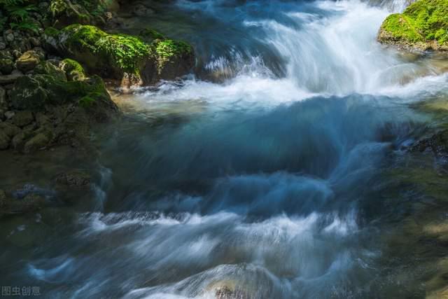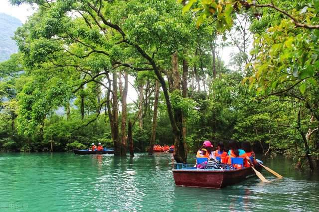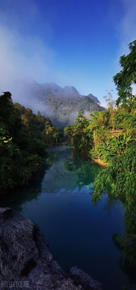 随着视角和光线的变化,卧龙潭水呈现出墨蓝、碧蓝、孔雀蓝、宝石蓝和绿蓝的渐次变幻,树木竹林倒影其间,美如仙境。