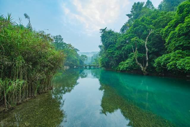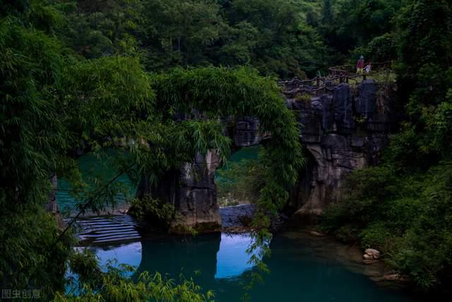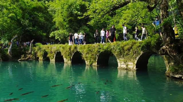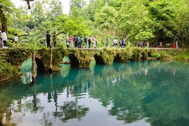 七孔桥下的涵碧潭,潭水蓝如宝石,绿如翡翠,令人心醉,不愧其'小九寨'的美誉。