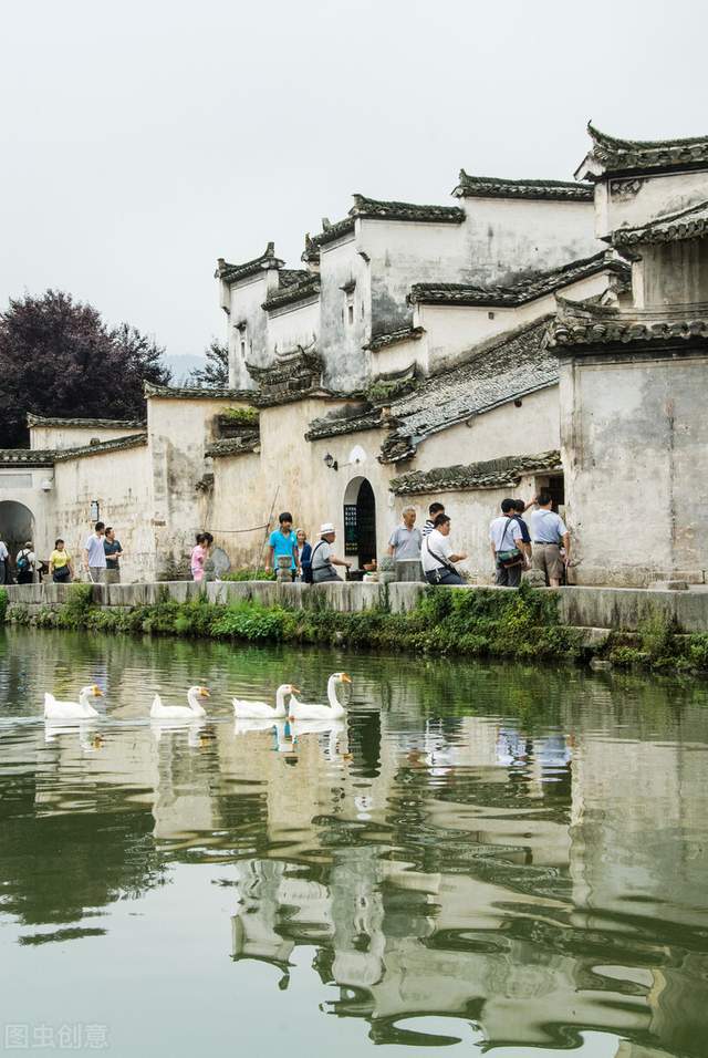 这种奇妙的场景,让我想起了马致远的那首《天净沙》中的深远清美的诗句:“古道,西风,瘦马。小桥,流水,人家。”一种幽美摄魂、令人遐想的意境在灵魂深处悄然滋生。走到村落中部的位置,一个半月型的湖牵引住了我的目光,导游介绍说,这个湖建于明朝的永乐年间,至今已有六百多年的历史。宏村七十六世祖汪思齐发现村中有一处天然的泉眼,一年四季泉流不息,就请人规划了一套完整的水系,开凿援引西溪之水,把水引入这处天然的泉眼处,建成半月型池塘,命名为“月沼”。听着这么带着神秘色彩的名字,我不由地对它产生了一种特别的好奇心。我迫不及待地紧走了几步靠近月沼,放眼望去,月沼里的水宛如一块美玉,碧绿通透,波澜不兴,水平如镜。
