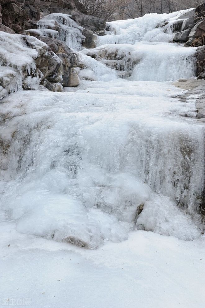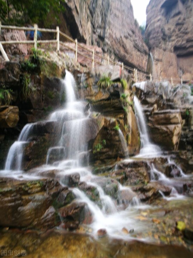 流水缓缓,便有了另一番妙处,清澈明净,平如镜面,倒映石壁,倒映天空,石壁铁红,天空湛蓝,红蓝处于一渠水中,色彩鲜明,如画。偶尔,石壁上一棵没有凋零的青松,探出头,随风摇曳,倒映在水中,画面有了动感,有趣。