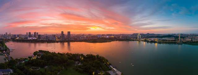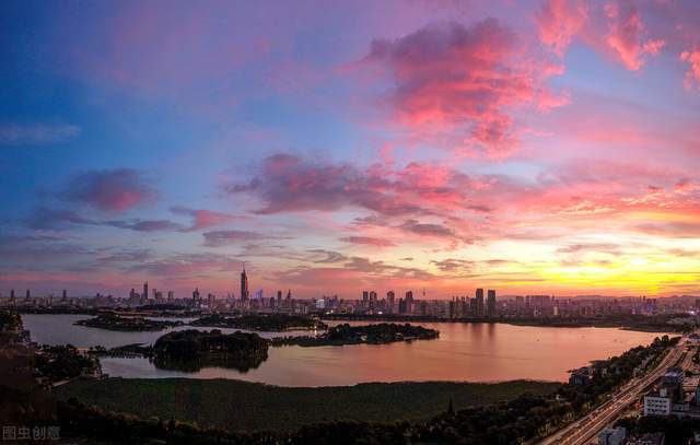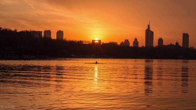 我们的游艇终于到达了对岸。回望玄武湖,已被晚霞烧成了火红,金黄,又变成一片绛紫。夕阳的半个脸儿落进了湖水里,若沉若浮,湖面变成了一幅绚丽巨大的油画……