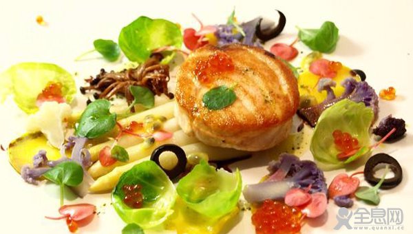 三文鱼、白芦笋、黄色西葫芦、黑橄榄、鲑鱼卵、布鲁塞尔甘蓝。